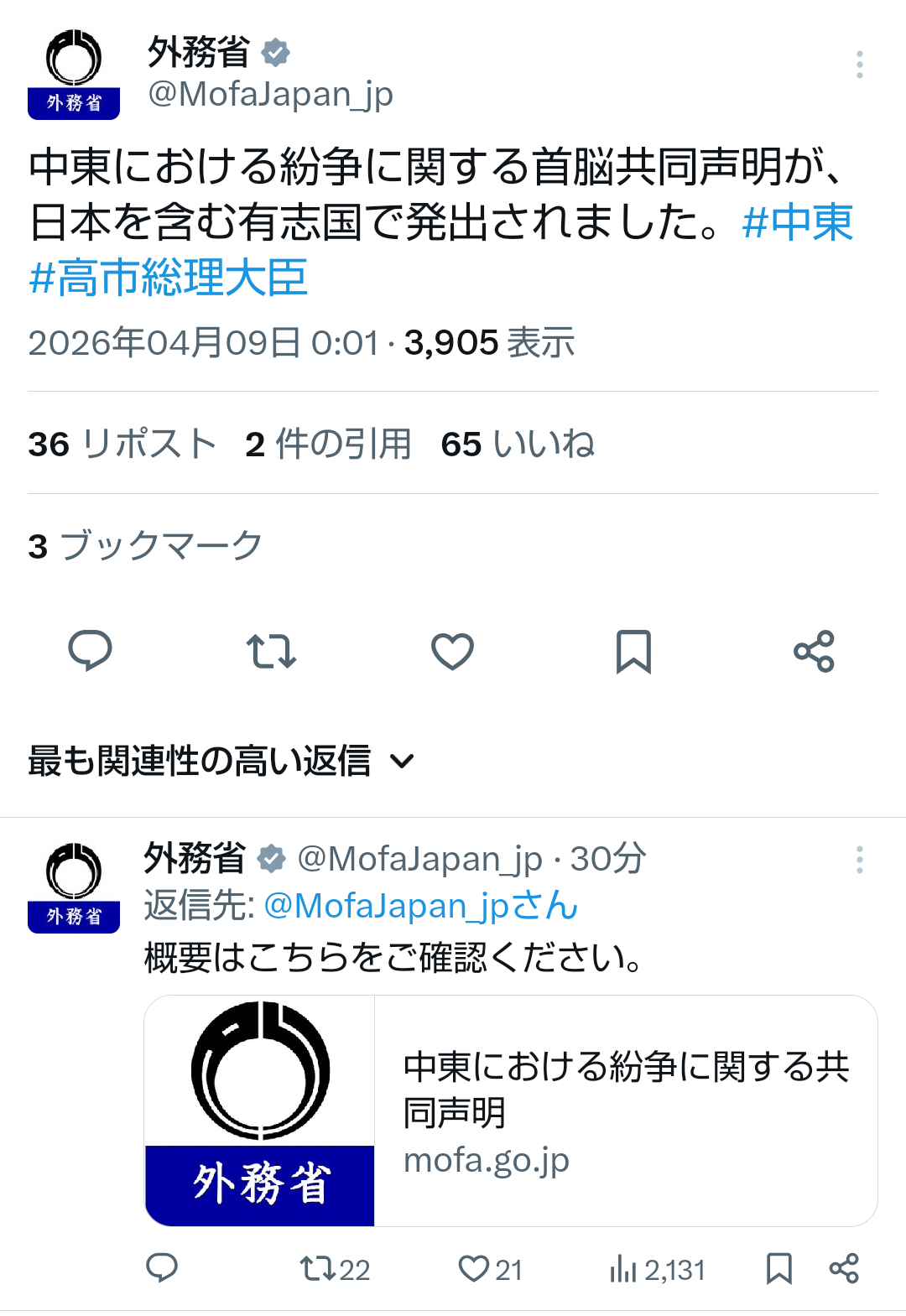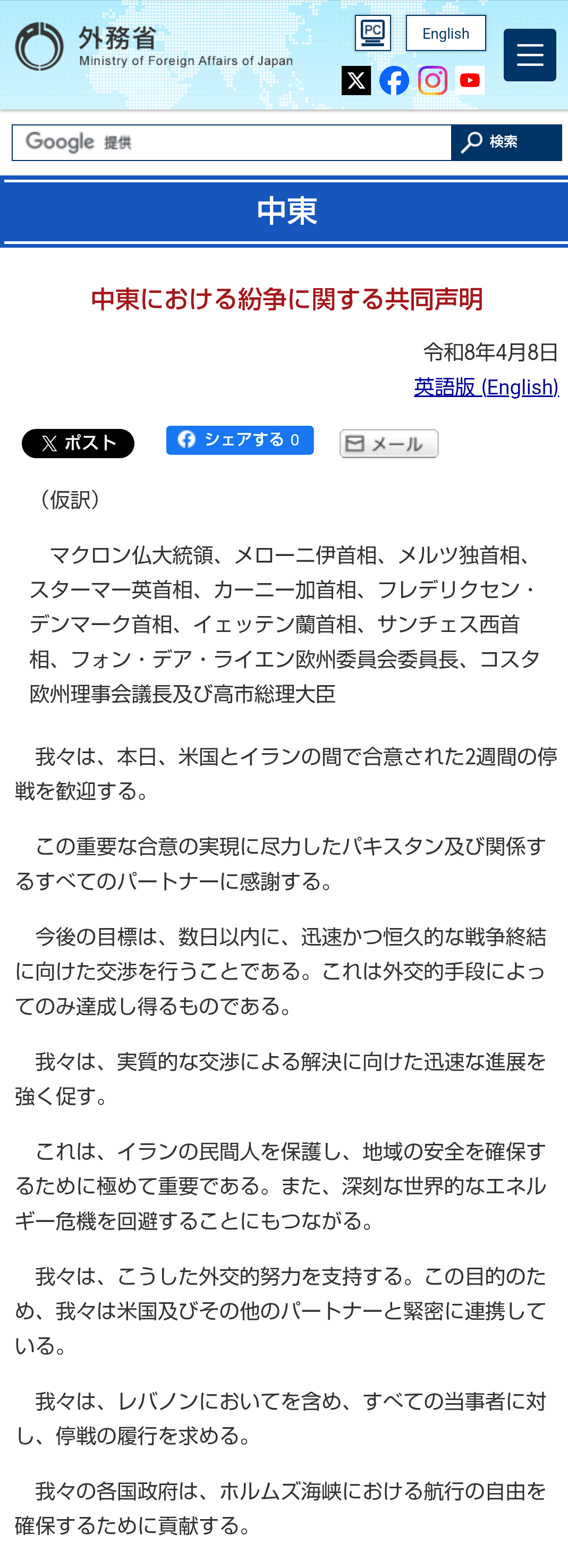| … | 18無題Name名無し 26/04/09(木)00:32:36No.791284そうだねx1 1775662356188.png-(630980 B) >中東における紛争に関する共同声明(仮訳) |