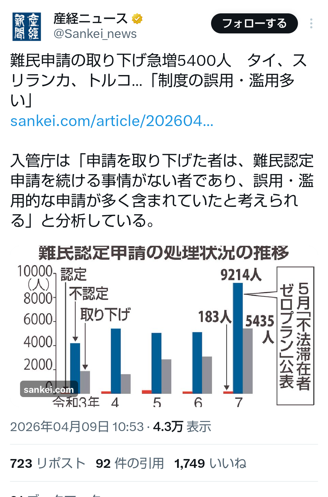 | … | 69無題Name名無し 26/04/09(木)12:27:02No.791352+ 1775705222404.png-(527945 B) >難民申請の取り下げ急増5400人 タイ、スリランカ、トルコ…「制度の誤用・濫用多い」 |