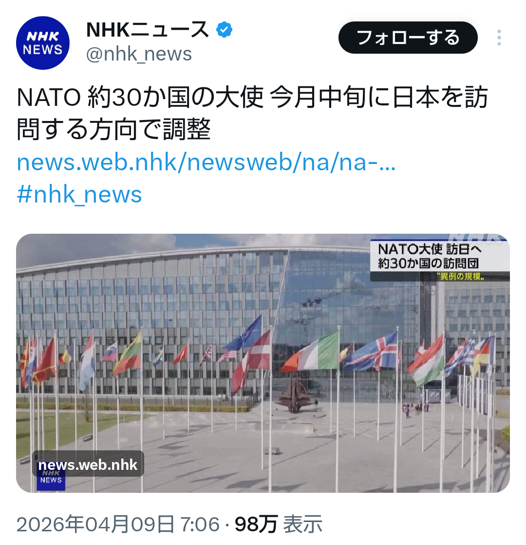 | … | 87無題Name名無し 26/04/09(木)13:23:38No.791376そうだねx1>>>NATO 約30か国の大使 今月中旬に日本を訪問する方向で調整 |