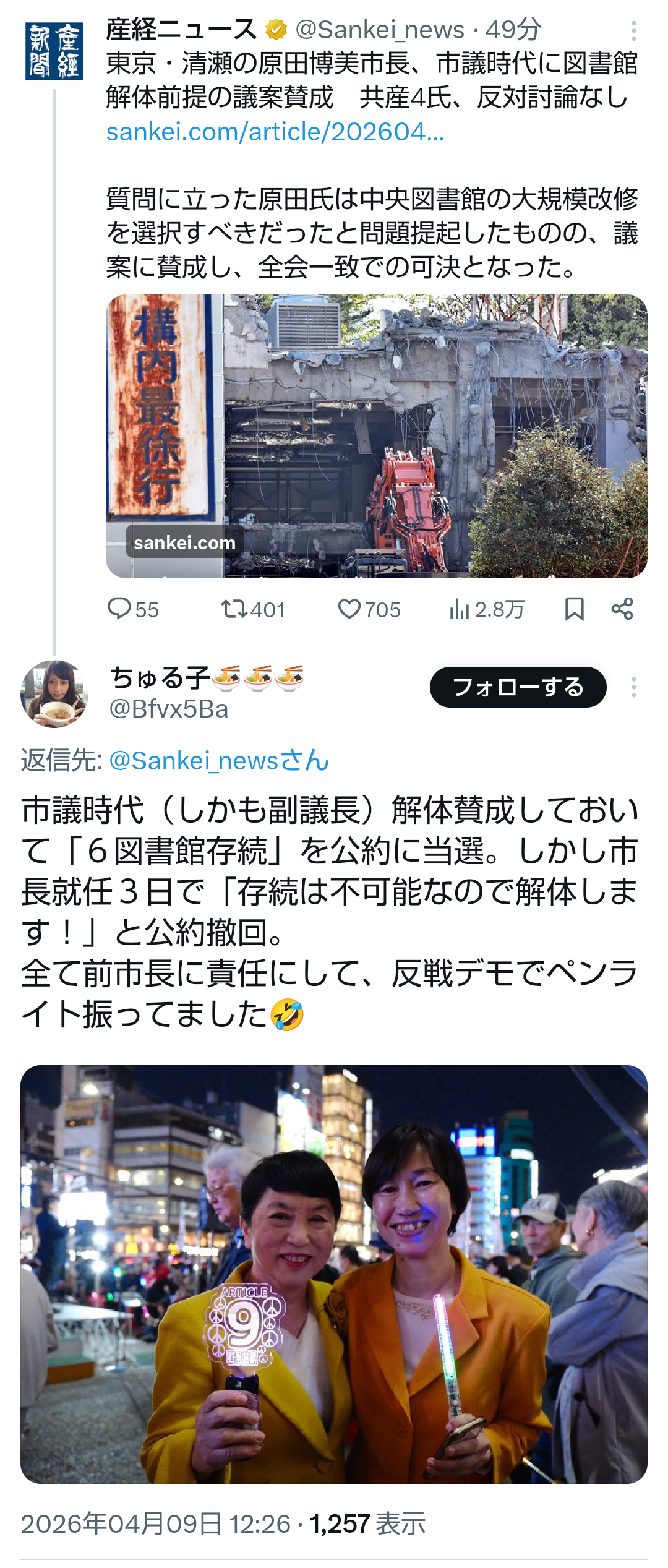 | … | 79無題Name名無し 26/04/09(木)13:12:01No.791362+ 1775707921600.png-(1906705 B) >東京・清瀬の原田博美市長、市議時代に図書館解体前提の議案賛成 共産4氏、反対討論なし |