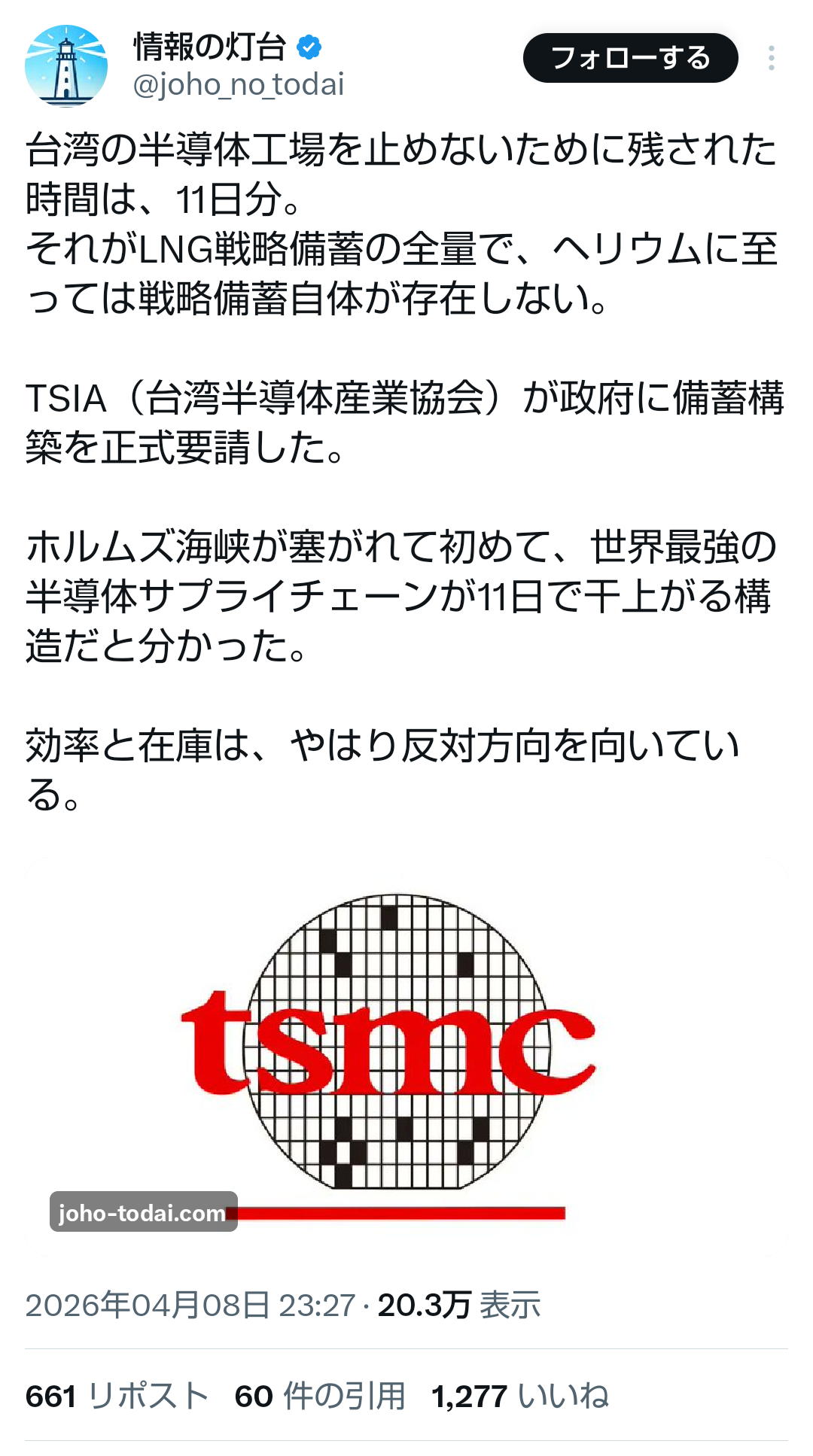 | … | 90無題Name名無し 26/04/09(木)14:40:39No.791390+ 1775713239681.png-(468435 B) >台湾の半導体工場を止めないために残された時間は、11日分。 |