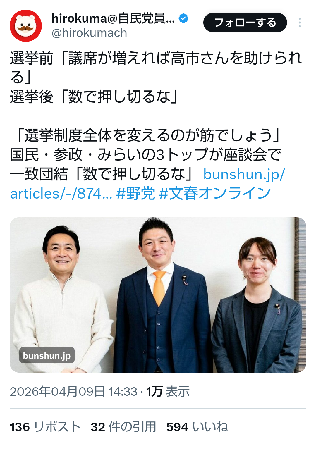 | … | 118無題Name名無し 26/04/09(木)19:34:58No.791424そうだねx6 1775730898329.png-(762466 B) >選挙前「議席が増えれば高市さんを助けられる」 |