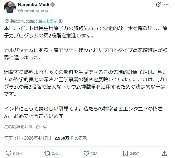 | … | 134無題Name名無し 26/04/09(木)21:56:10No.791441+ 1775739370449.jpg-(84895 B) >本日、インドは民生用原子力の旅路において決定的な一歩を踏み出し、原子力プログラムの第2段階を推進します。 |