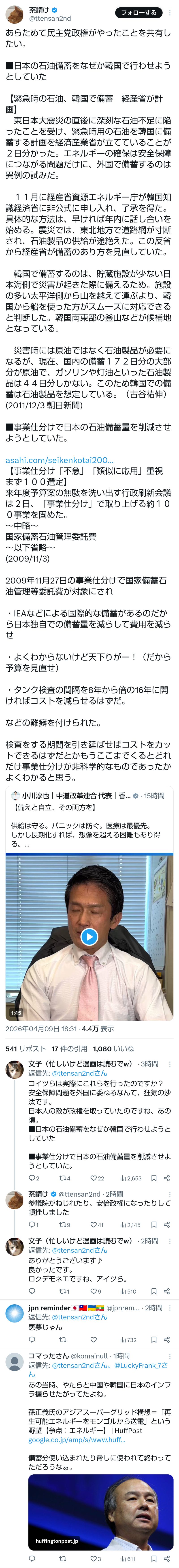 | … | 138無題Name名無し 26/04/09(木)22:39:51No.791445そうだねx2 1775741991850.jpg-(845173 B) >あらためて民主党政権がやったことを共有したい。日本の石油備蓄をなぜか韓国で行わせようとしていた |