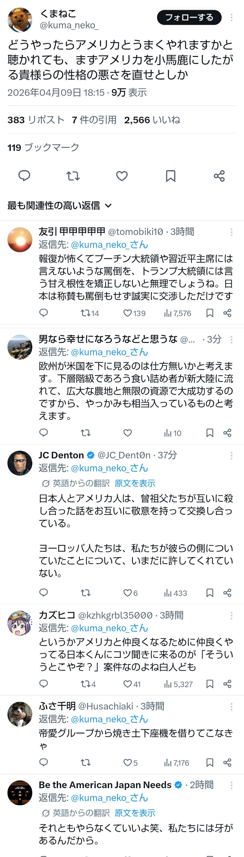 | … | 151無題Name名無し 26/04/09(木)23:30:50No.791459+ 1775745050386.jpg-(319234 B) >どうやったらアメリカとうまくやれますかと聴かれても、まずアメリカを小馬鹿にしたがる貴様らの性格の悪さを直せとしか |