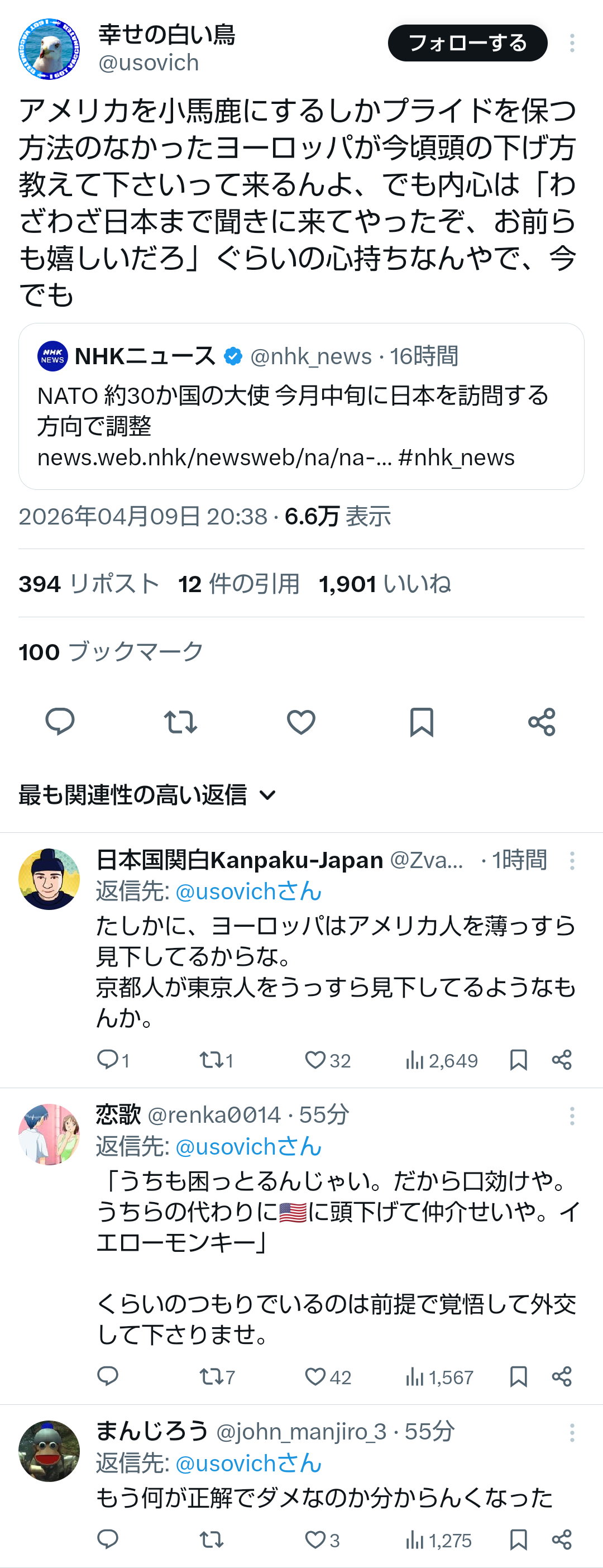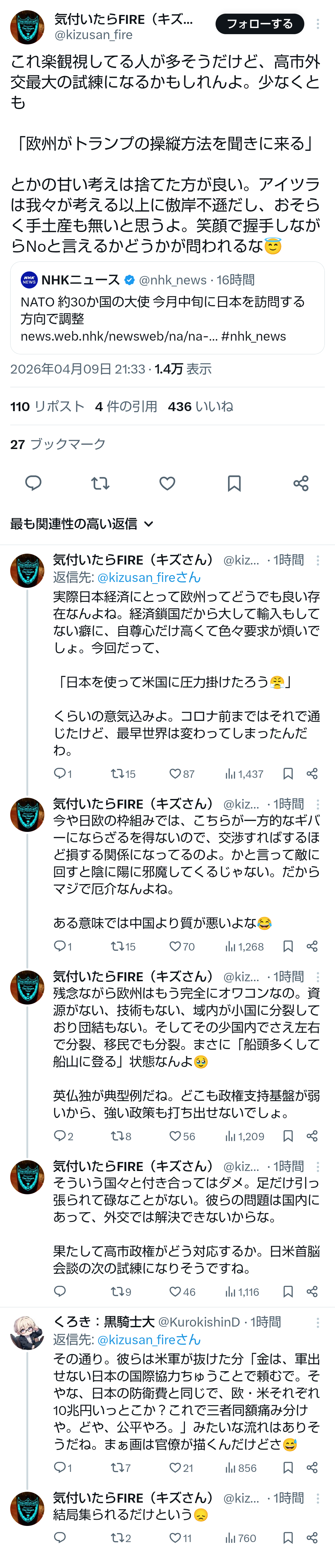 | … | 80無題Name名無し 26/04/09(木)13:12:04No.791363そうだねx8>NATO関係者 「日本が、アメリカからのさまざまな要求にどう応え、うまく関係を保っているのかを知りたい」(NHKの取材に対して) |