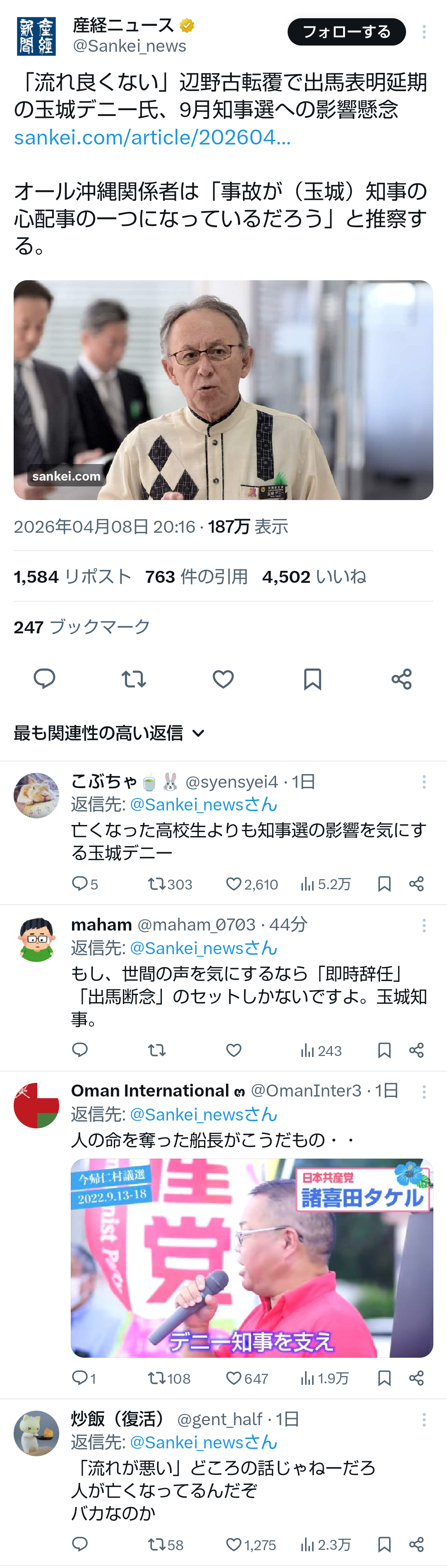 | … | 164無題Name名無し 26/04/10(金)00:11:33No.791472そうだねx9 1775747493548.png-(1398853 B) >「流れ良くない」辺野古転覆で出馬表明延期の玉城デニー氏、9月知事選への影響懸念 |