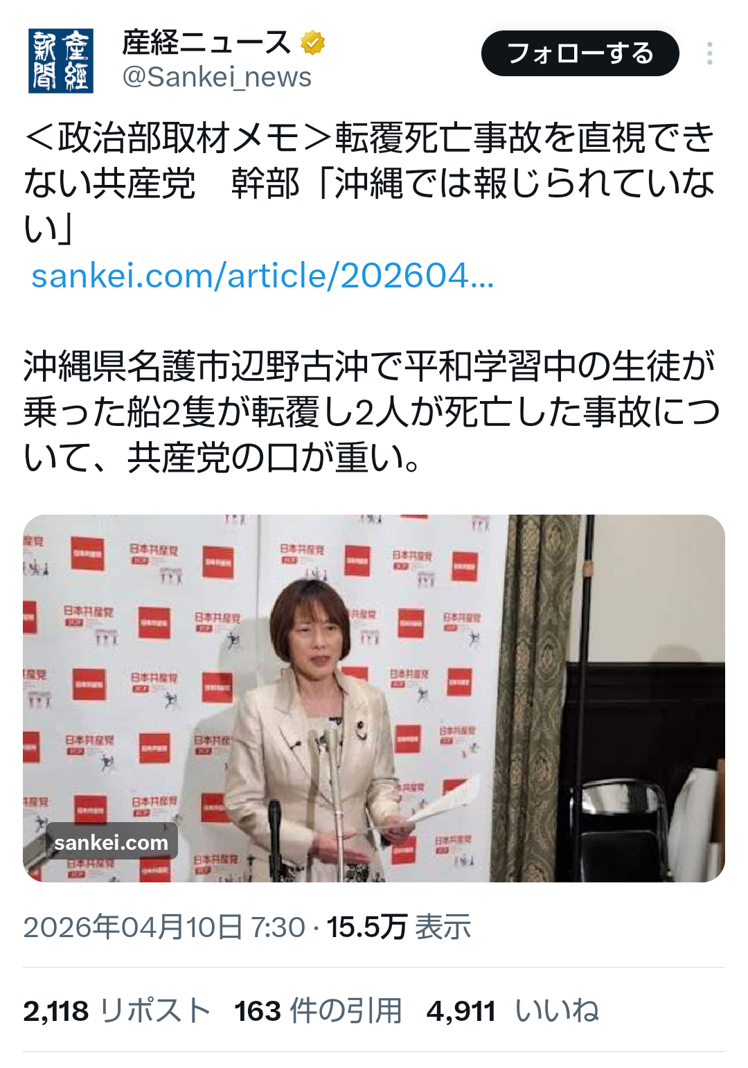 | … | 184無題Name名無し 26/04/10(金)11:42:20No.791508+ 1775788940822.png-(754773 B) ><政治部取材メモ>転覆死亡事故を直視できない共産党 幹部「沖縄では報じられていない」 |