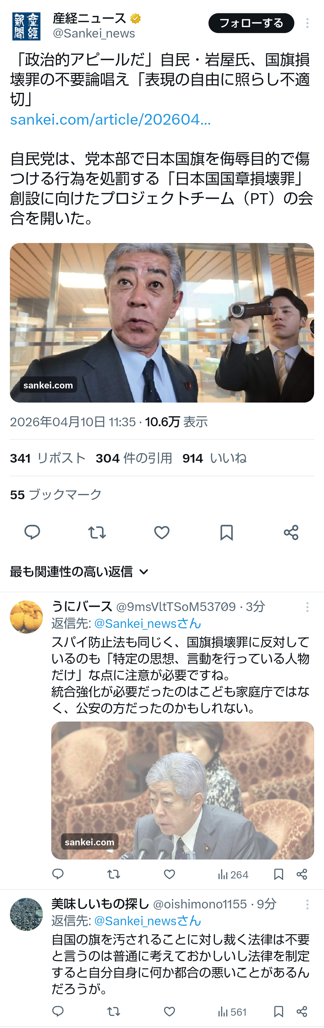 | … | 189無題Name名無し 26/04/10(金)12:46:53No.791513+ 1775792813012.png-(1508027 B) >「政治的アピールだ」自民・岩屋氏、国旗損壊罪の不要論唱え「表現の自由に照らし不適切」 |