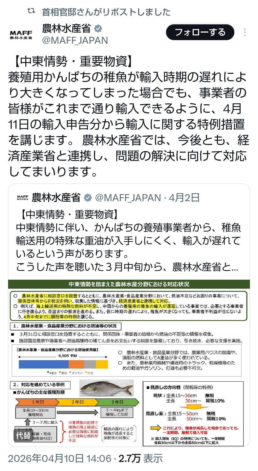 | … | 192無題Name名無し 26/04/10(金)13:11:17No.791517+今の想定(輸入量)だと来年の8月まで備蓄込みで今の消費量のままいける日本ってすごいな |