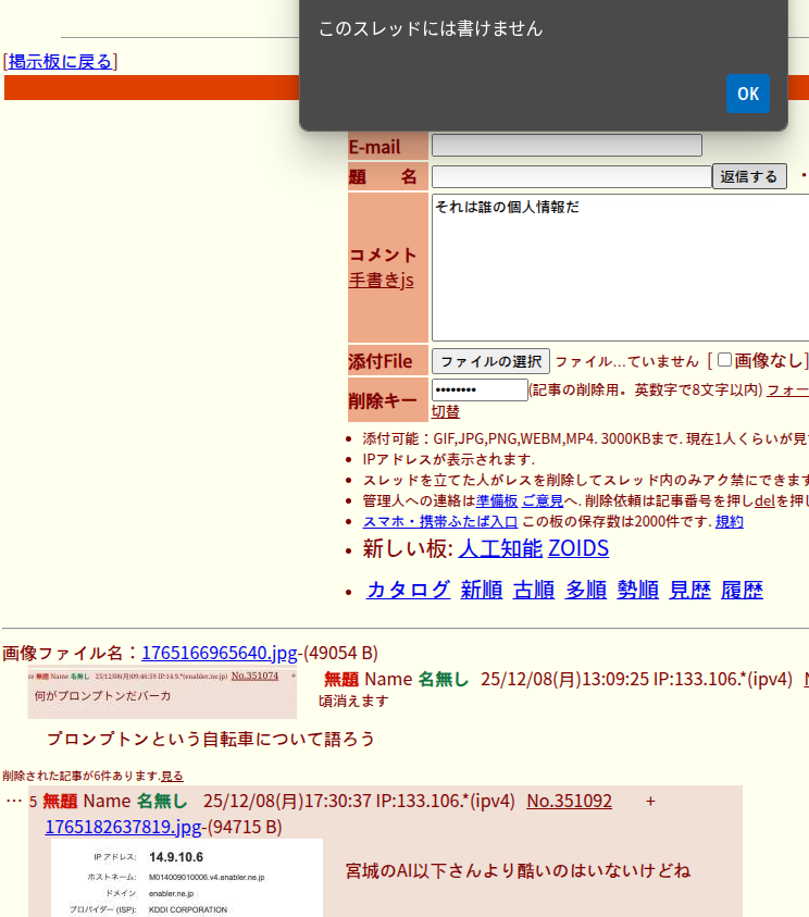 | … | 39無題Name名無し 25/12/15(月)10:11:09 IP:14.9.*(enabler.ne.jp)No.351151+他人のIPアドレスを躊躇なく貼ってるレベルだ |